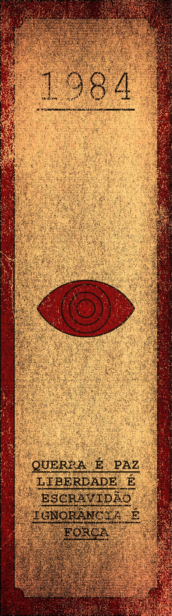 Aqui coloquei o título do livro, o slogan do Partido que é citado por todo o livro e fiz um logo baseado na minha interpretação sobre a presença sobrenatural do Partido no mundo do livro, um olho atento, sem pupila e com as íris remetendo a ondas hipnóticas.